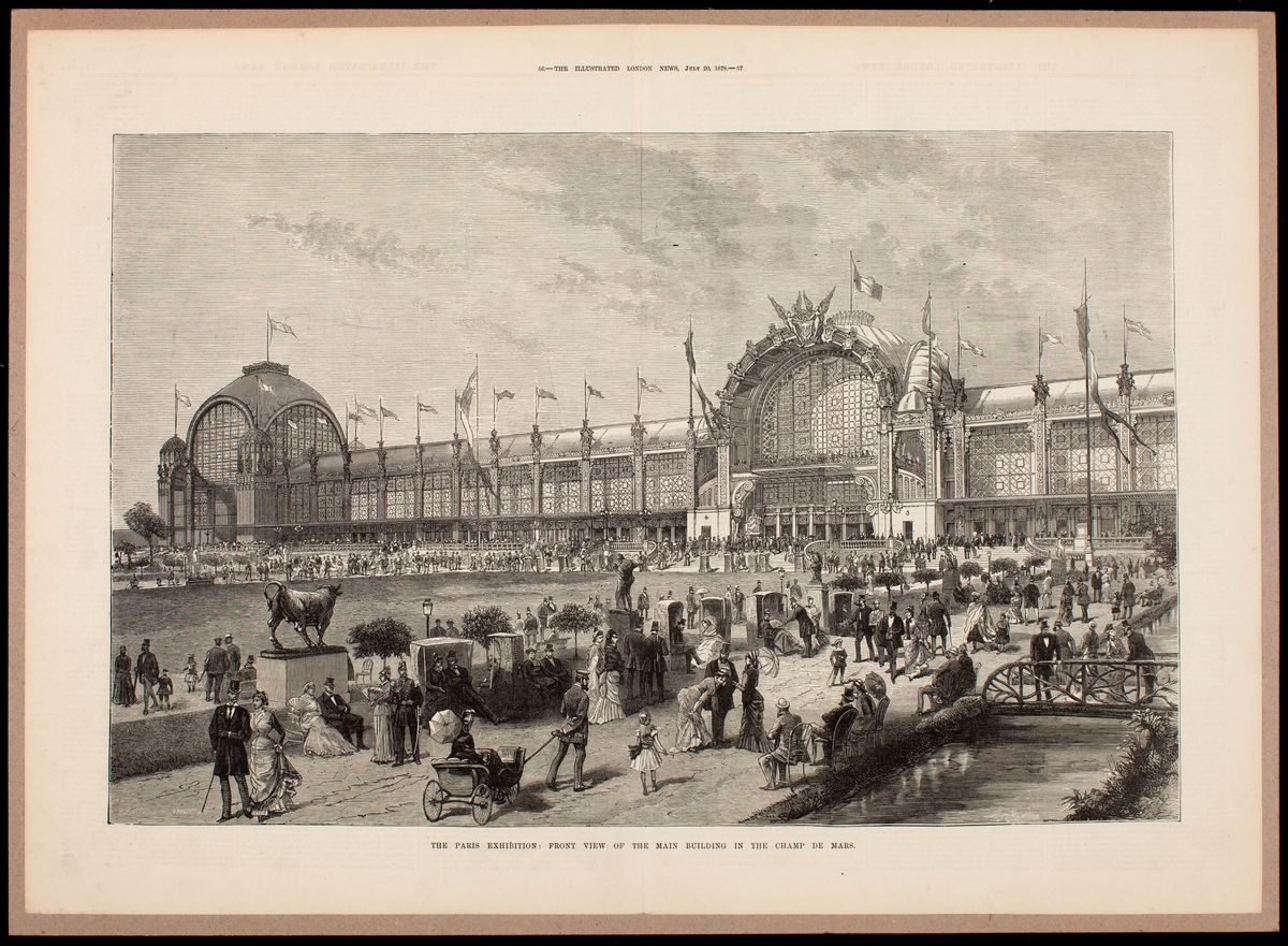 Plansch med motiv av etsning av vy över Världsutställningen 1878, Exposition universelle de 1878. Vy över huvudbyggnaden. Bilaga i tidningen The Illustrated London News 20 juli 1878.