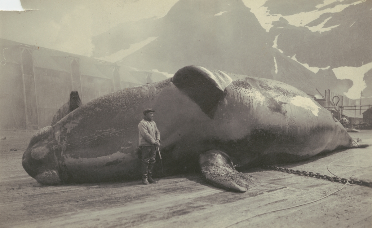 Bild från expedition i Antarktisområdet. Motiv av man vid fångad val, 1929.