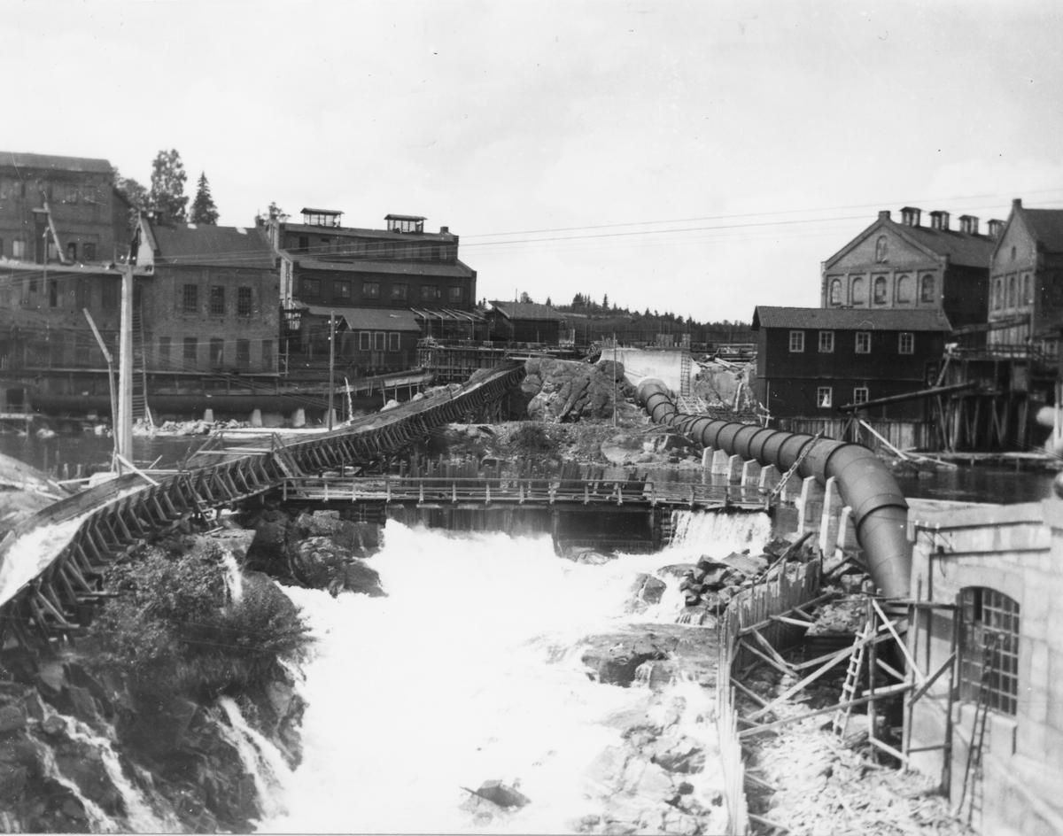 Industrimiljö med forsande vatten, vattenkraftverk.
