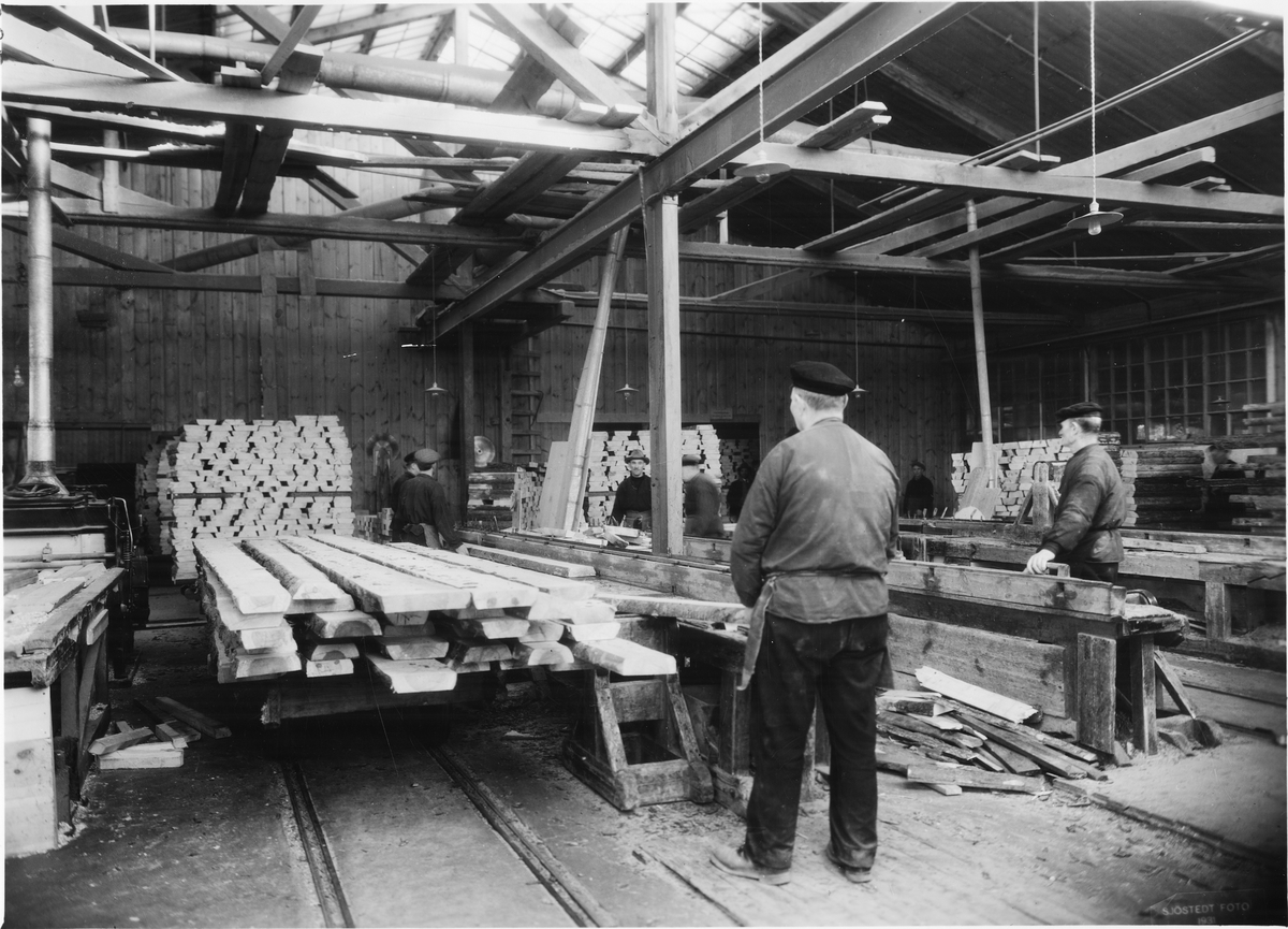 Säfveåns Aktiebolag. Interiör. Plankorna sågas i lämpliga längder.