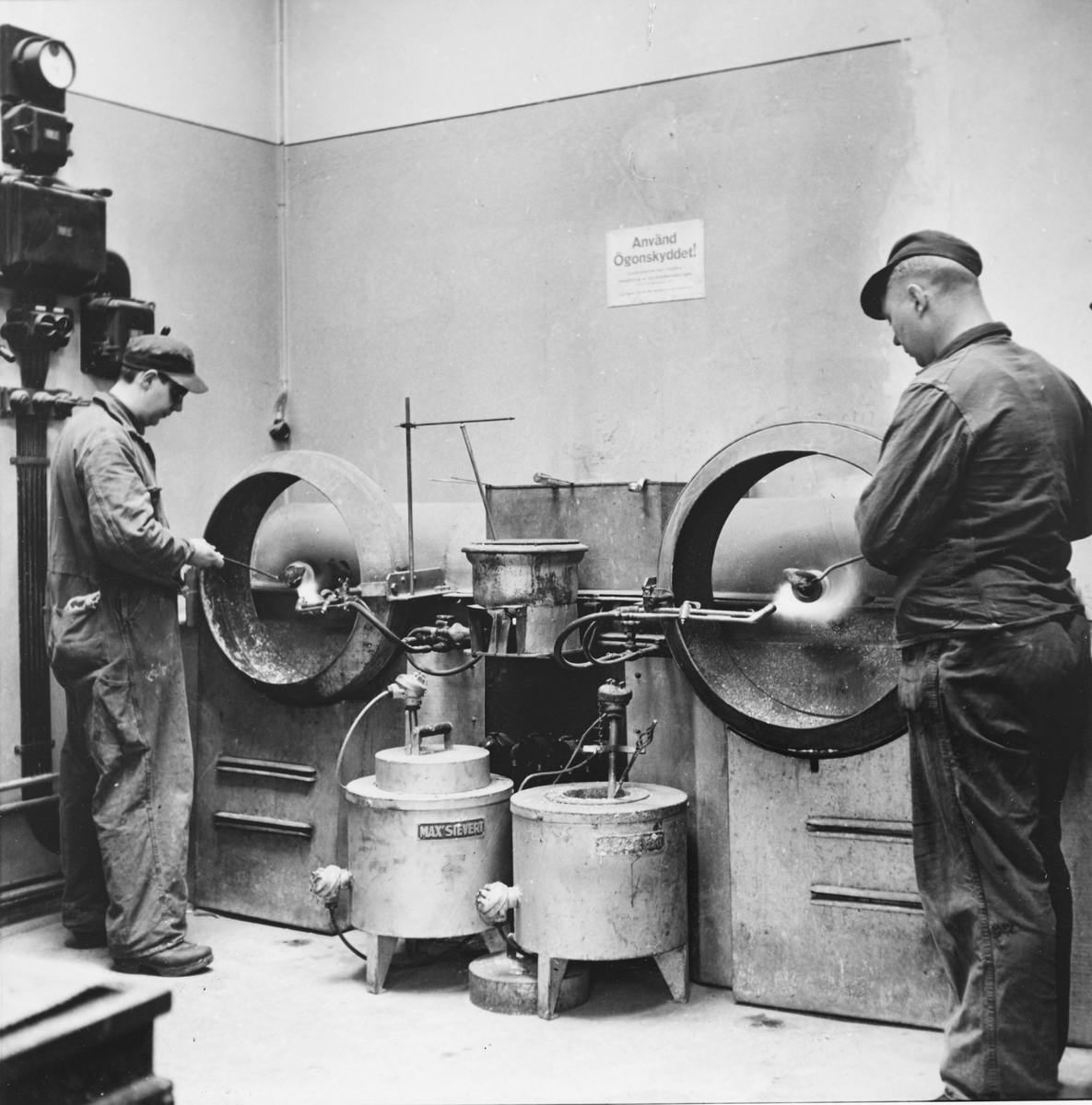 Sterner och Blomquist AB, Malmö, 1944. Lagergjutning. I samband med vevaxelslipningen omgjutes lagren. Detta sker i specialmaskiner, som garantera homogent och blåsfritt gods. Bilden visar slunggjutning, en av firmans metoder för lagergjutning.