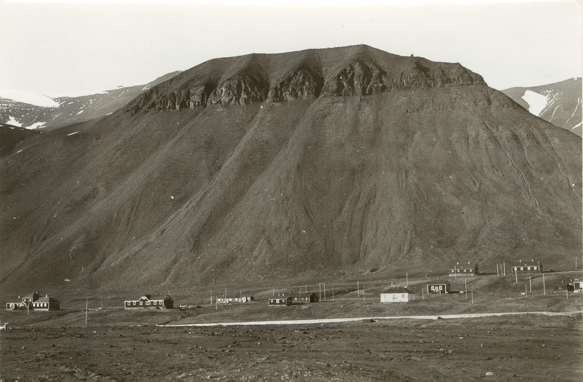 Fotografi från expedition till Spetsbergen. Vy över Sveagruvan. på bilden syns från vänster: "Slottet" (direktörs- och läkarbostaden), befälsbostaden, "Torpet" (den äldsta bebyggelsen). Det vita huset till höger är sjukstugan. De två byggnaderna längst bak vid foten av berget är förmansbostäder.