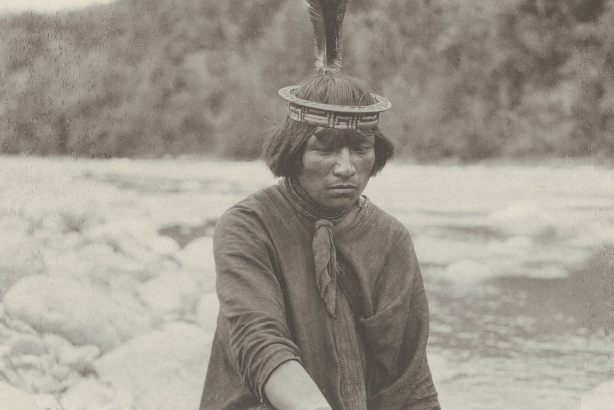 Fotografi från kuvert märkt med "Ernst Nordenskjöld". Motiv av man med fjäder i håret.