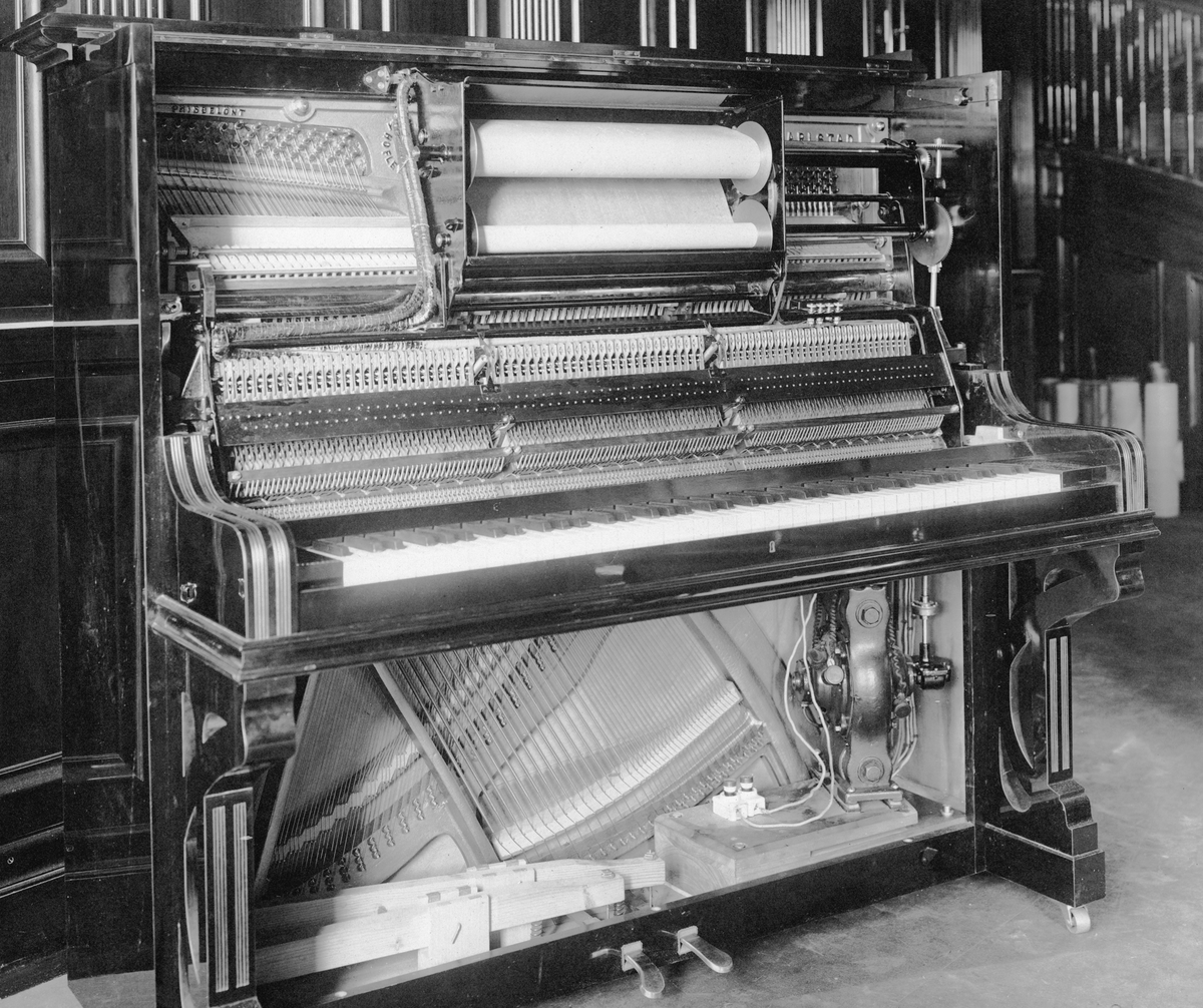 Självspelande piano (Melographpiano), öppet, äldsta experimentet. Konstruktör ing. John E. Hansson, 1908. Kungl Hofleverantör Nyström Karlstad.