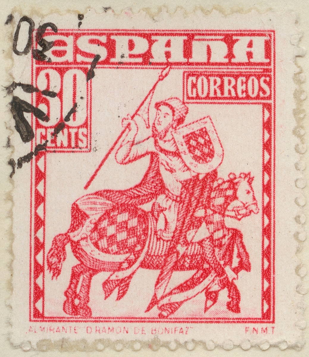 Frimärke från Spanien, 1948. Motiv av Medeltidssriddare med spjut: Amiral Ramon de Bonifaz:s sonson- 700-årsminne av spanska flottan och återerövringen av Sevilla- 1248-1948.
