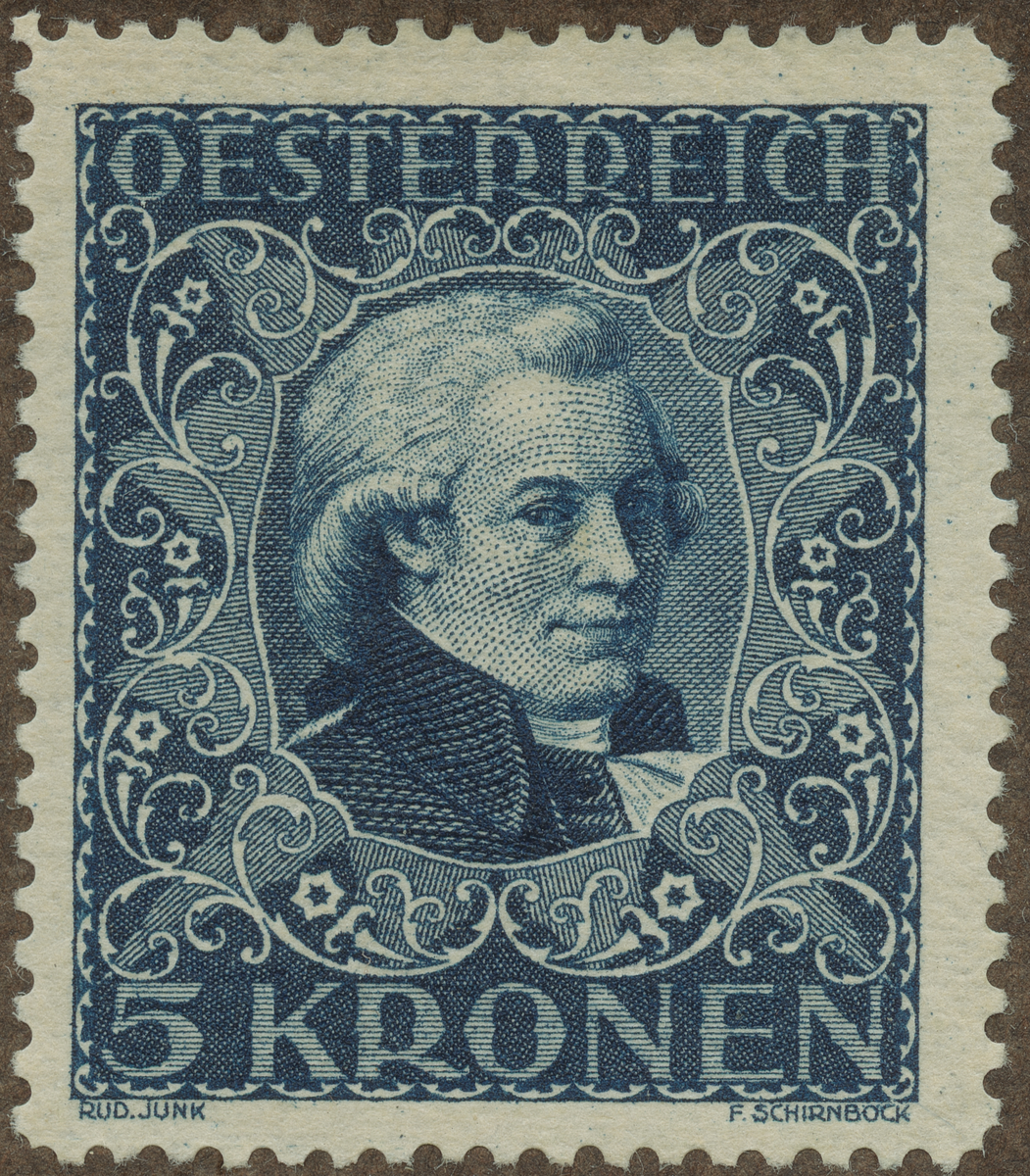Frimärke från Österrike, 1922. Motiv av Wolfgang Amadeus Mozart 1756-1791 Kompositör.