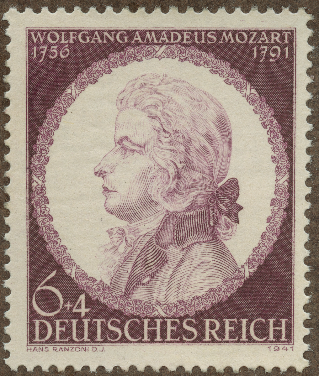 Frimärke från Väst Tyskland, 1941. Motiv av Wolfgang Amadeus Mozart 1756-1791 Kompositör 150-årsminne av hans död 1791-1941.