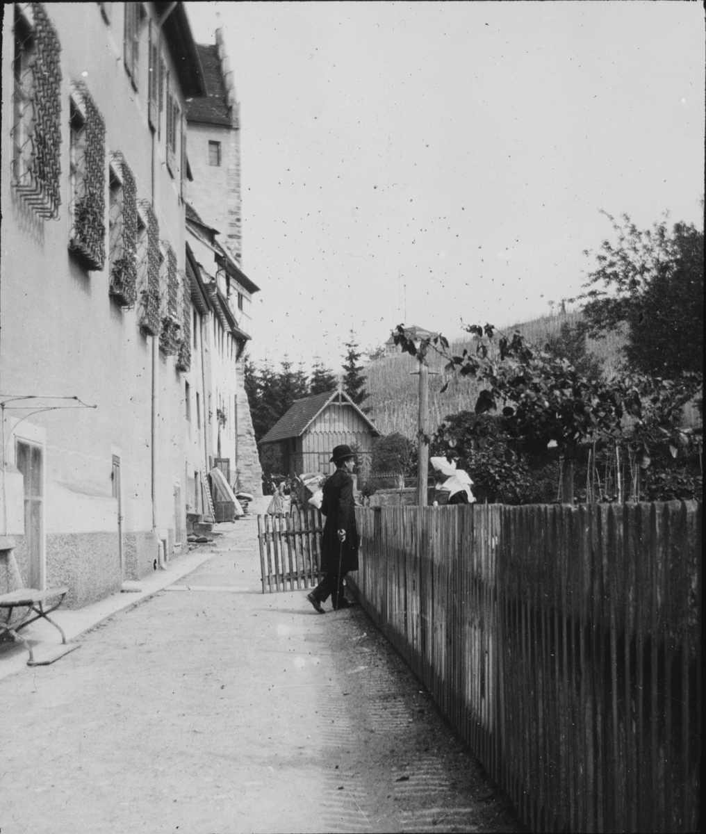 Skioptikonbild med motiv av man och kvinna vid staket in till odlingar i staden Meersburg am Bodensee.