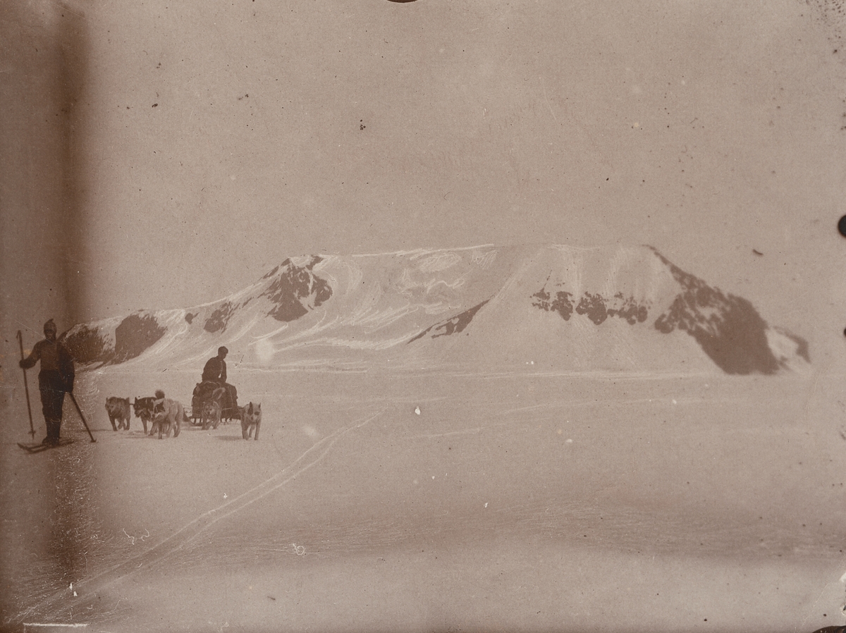 Fotografi från första svenska Antarktisexpeditionen 1901-1904. Motiv av två män med hundspann och släde i ett snölandskap.