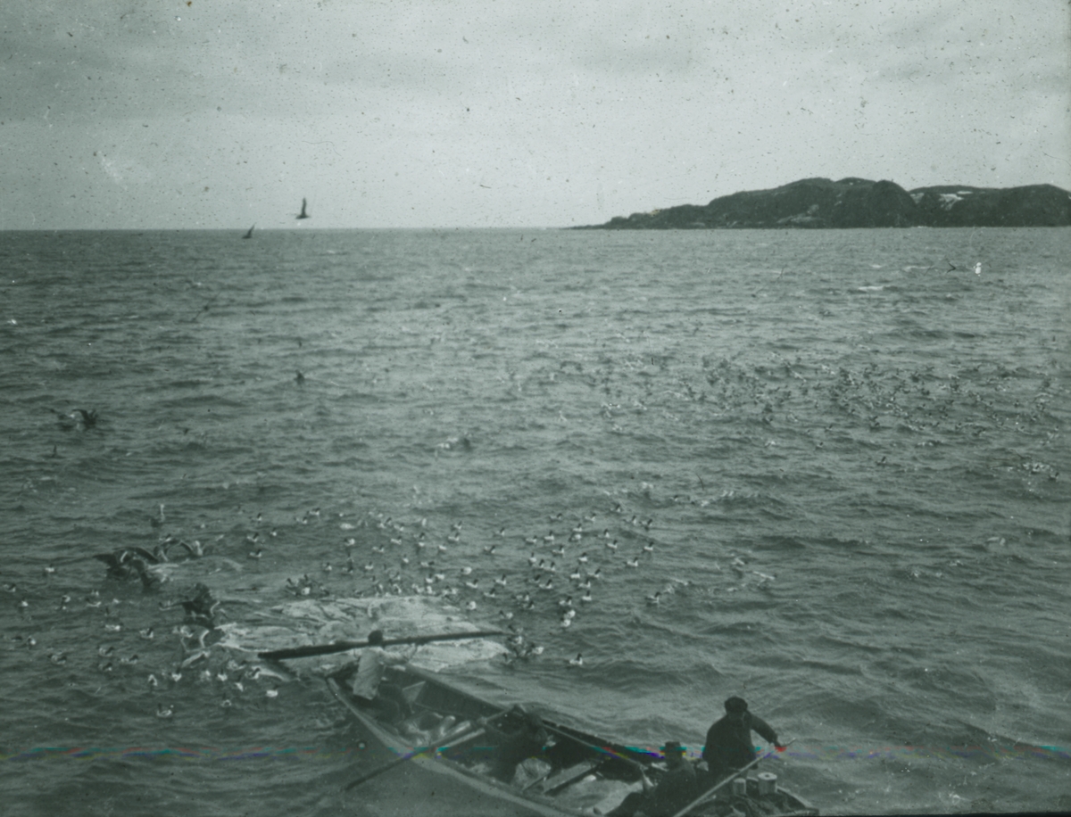 Fotografi från Grönland. Motiv av män i båt på havet bland fåglar.