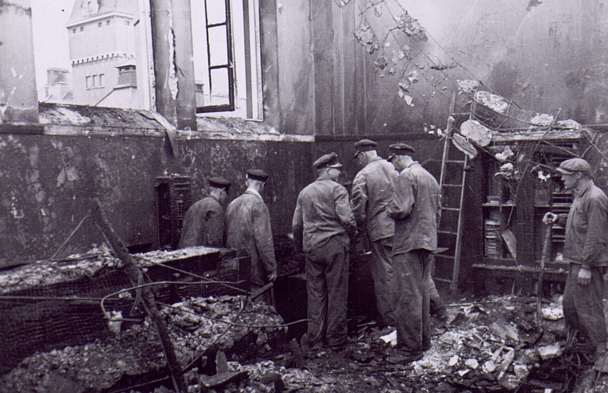 Branden i Västerås telefonstation den 22 sept. 1942. Röjningsarbete i telefonsalen.