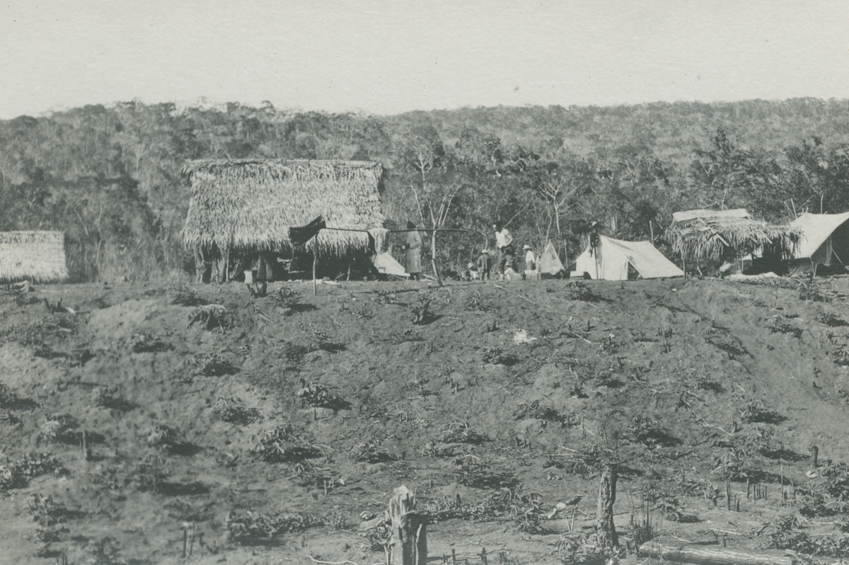 Fotografi från expedition till Peru 1920. Motiv av hyddor med halmtak och vita tält framför djungel.