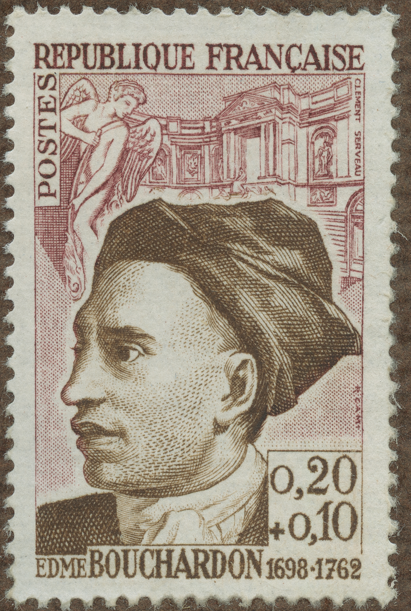 Frimärke från Frankrike, 1962. Motiv av Edme Bouchardon: 1698-1762. Fransk skulptör Större figurgrupper och statyer huvudsakligen i Paris. "Serie: "Berömda fransmän" till förmån för Röda Korset