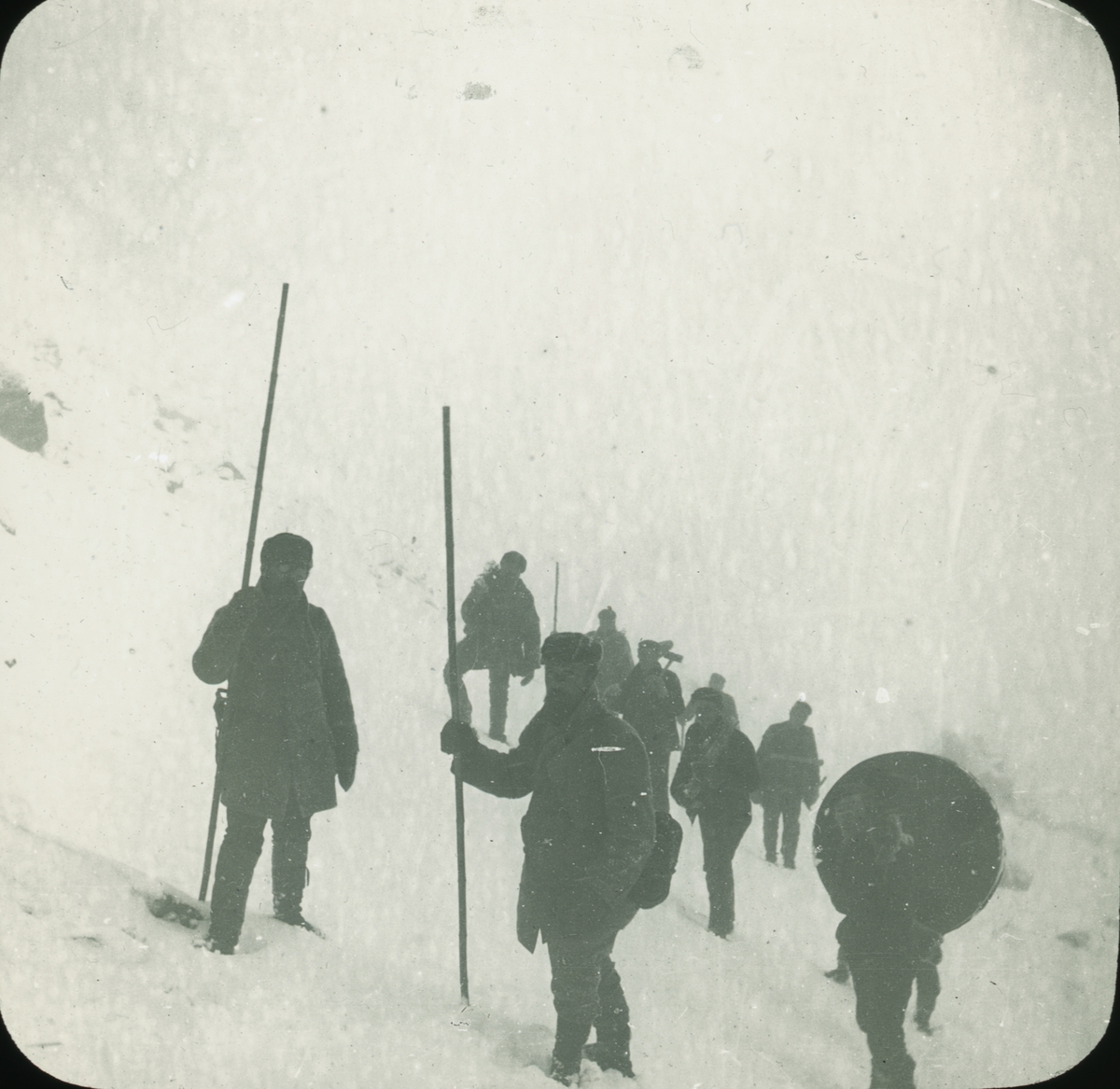 Fotografi från expedition till Spetsbergen. Motiv av expeditionsdeltagare i snölandskap.