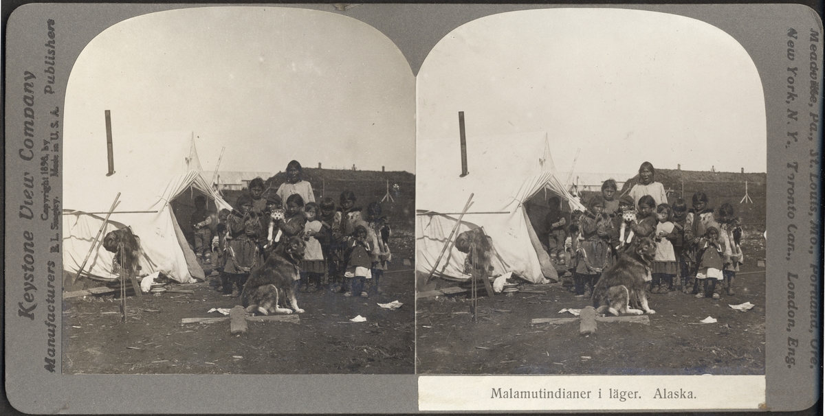 Stereobild av malamutindianer i läger. Alaska.