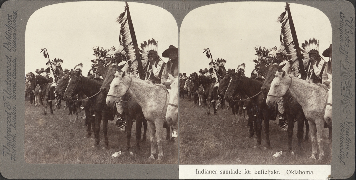 Stereobild av indianer samlade för buffeljakt i Oklahoma.