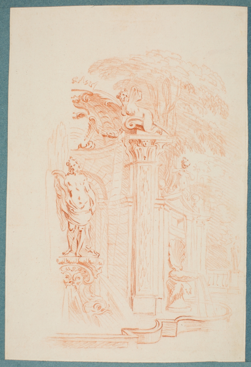 Ritning av fontän. Rödkrita. Ur Carl Johan Cronstedts samling.