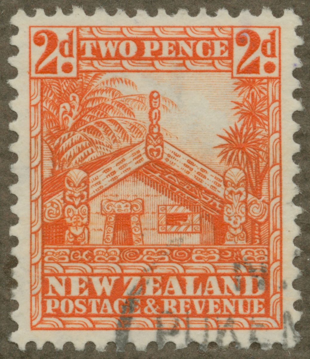 Frimärke från Nya Zeeland, 1935. Motiv av hydda byggd av Maorifolket.
