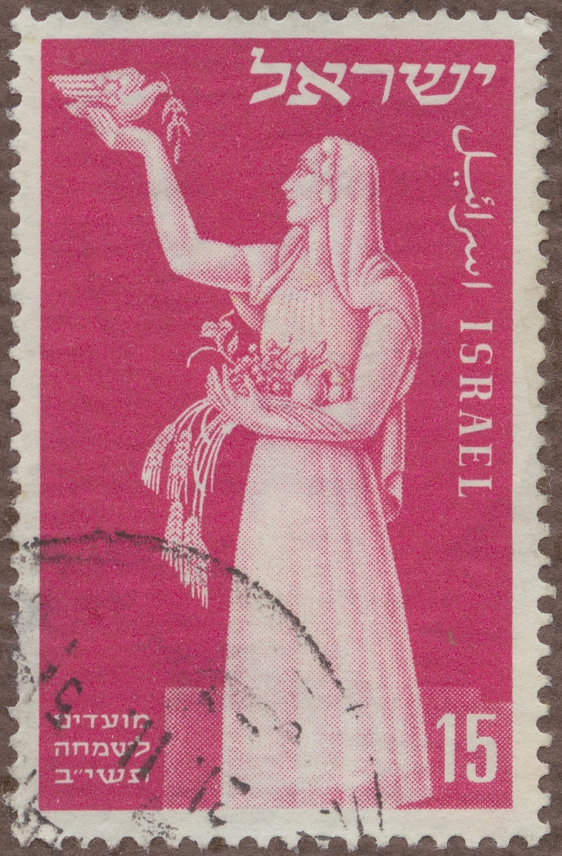 Frimärke från Israel, 1951. Motiv av kvinna med druvor, frukter och sädesax. "Judiska Nyår (Ros Hashonnah: 5712)".