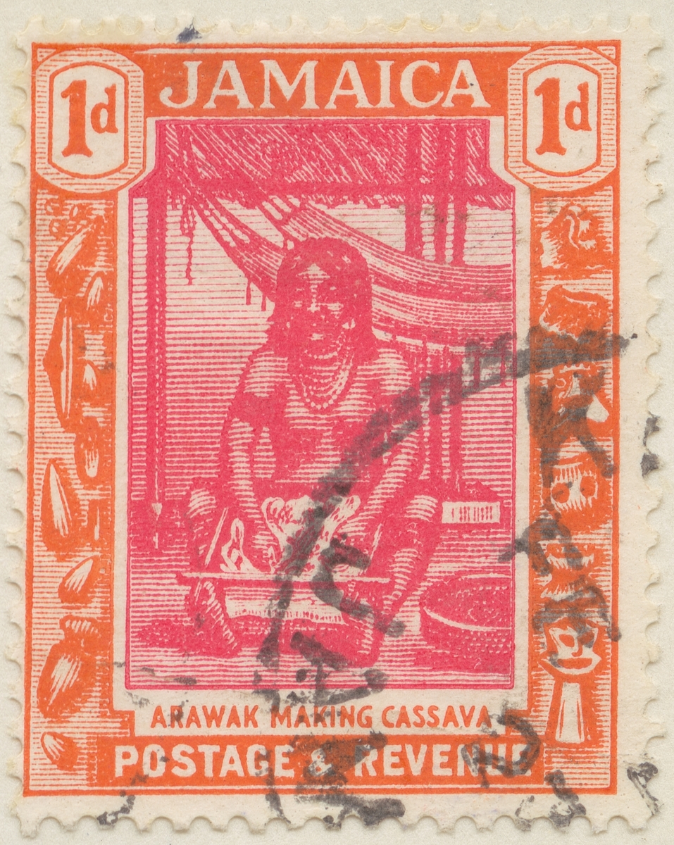 Frimärke från Jamaica, 1920. Motiv av tillverkning av cassava. "Aravakiska".