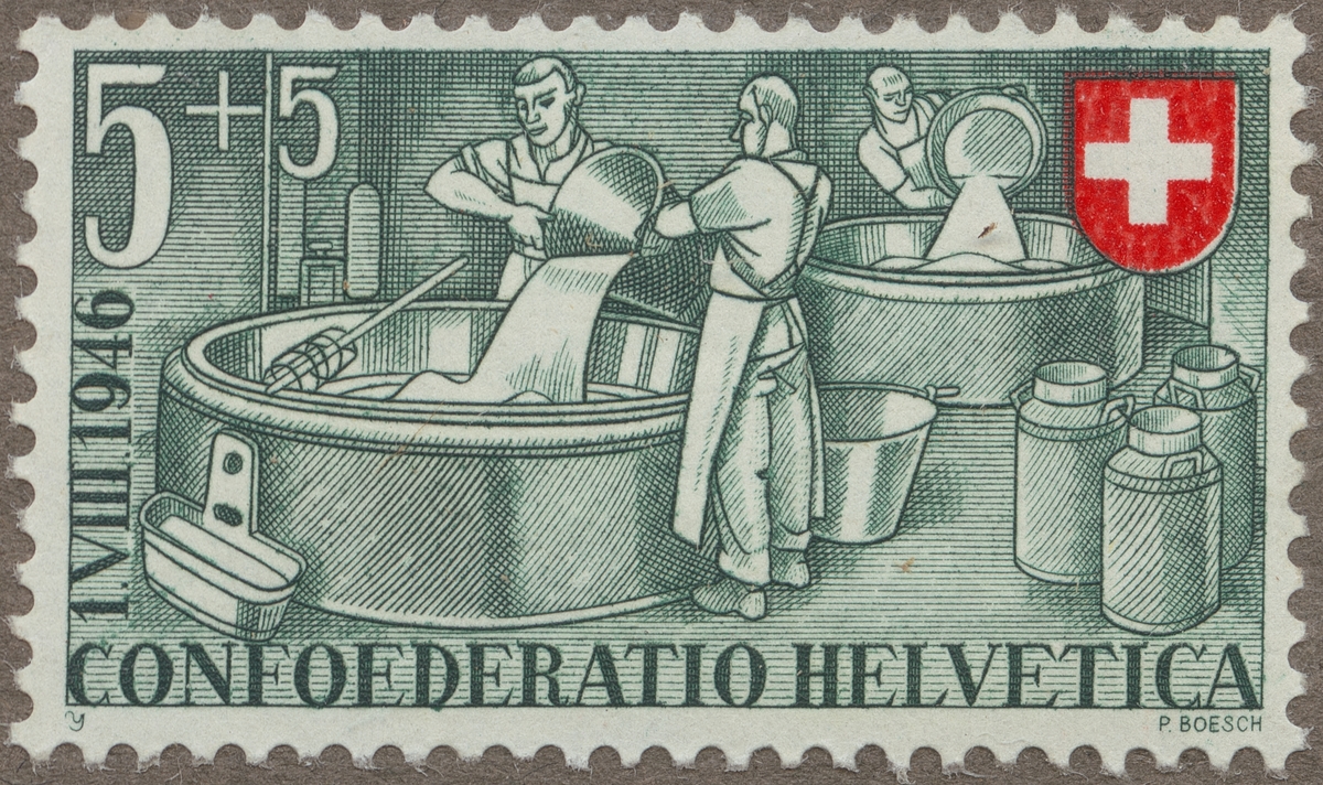 Frimärke från Schweiz, 1946. Motiv av ostfabrik (Emmenthaler). "Nationaldagen d. 1 augisti 1946". "Serie till förmån för landsmän bosatta i utlandet".