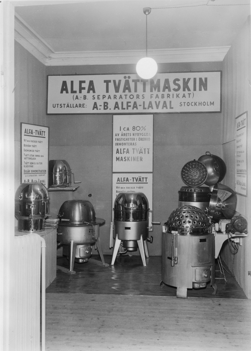 Bygge och Bo-utställningen i Örebro 1937. Alfa Tvättmaskin. Monter för AB Alfa Lavals tvättmaskiner.