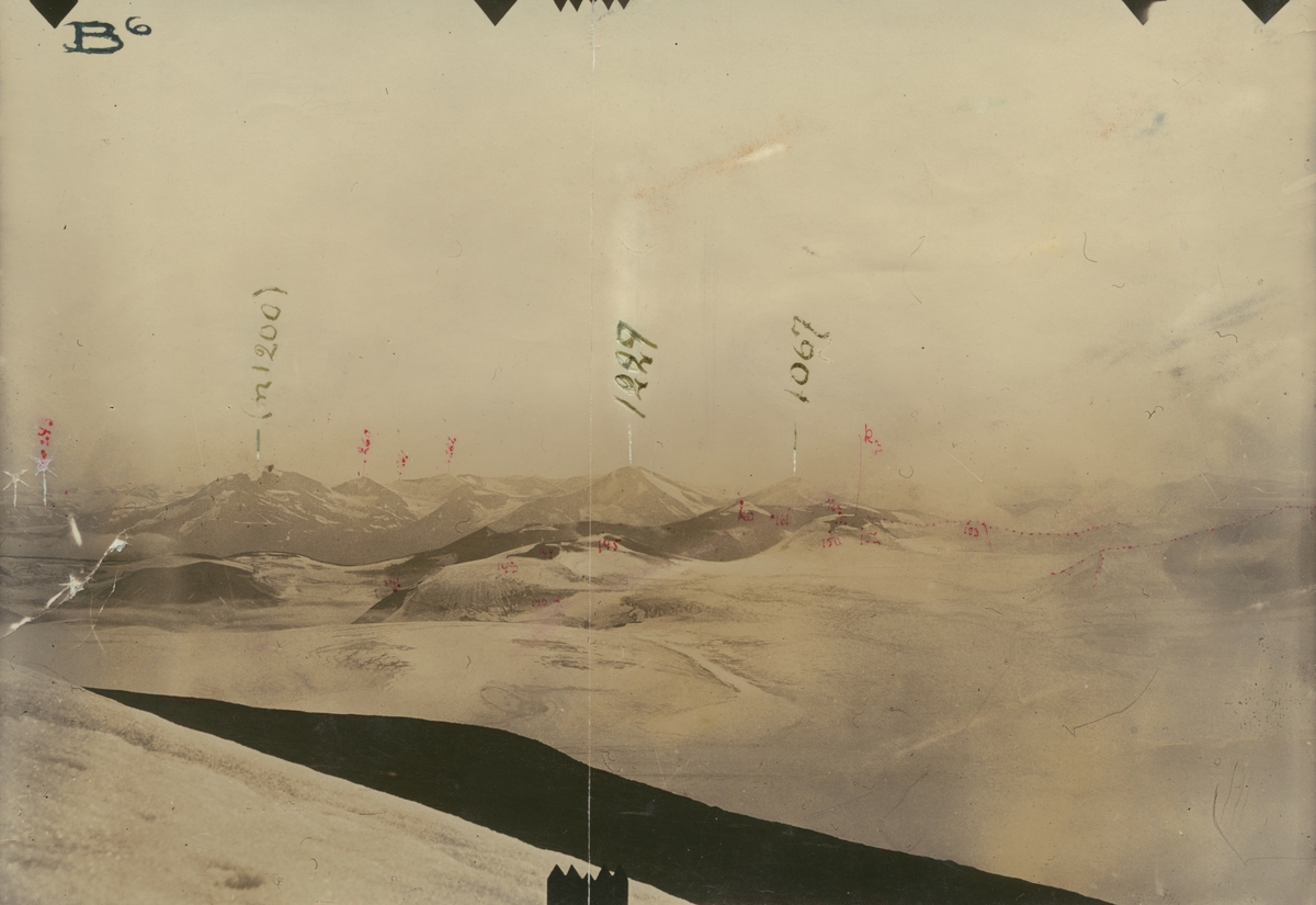 Fotografi från expedition till Spetsbergen 1920. Vy över istäckt bergslandskap.