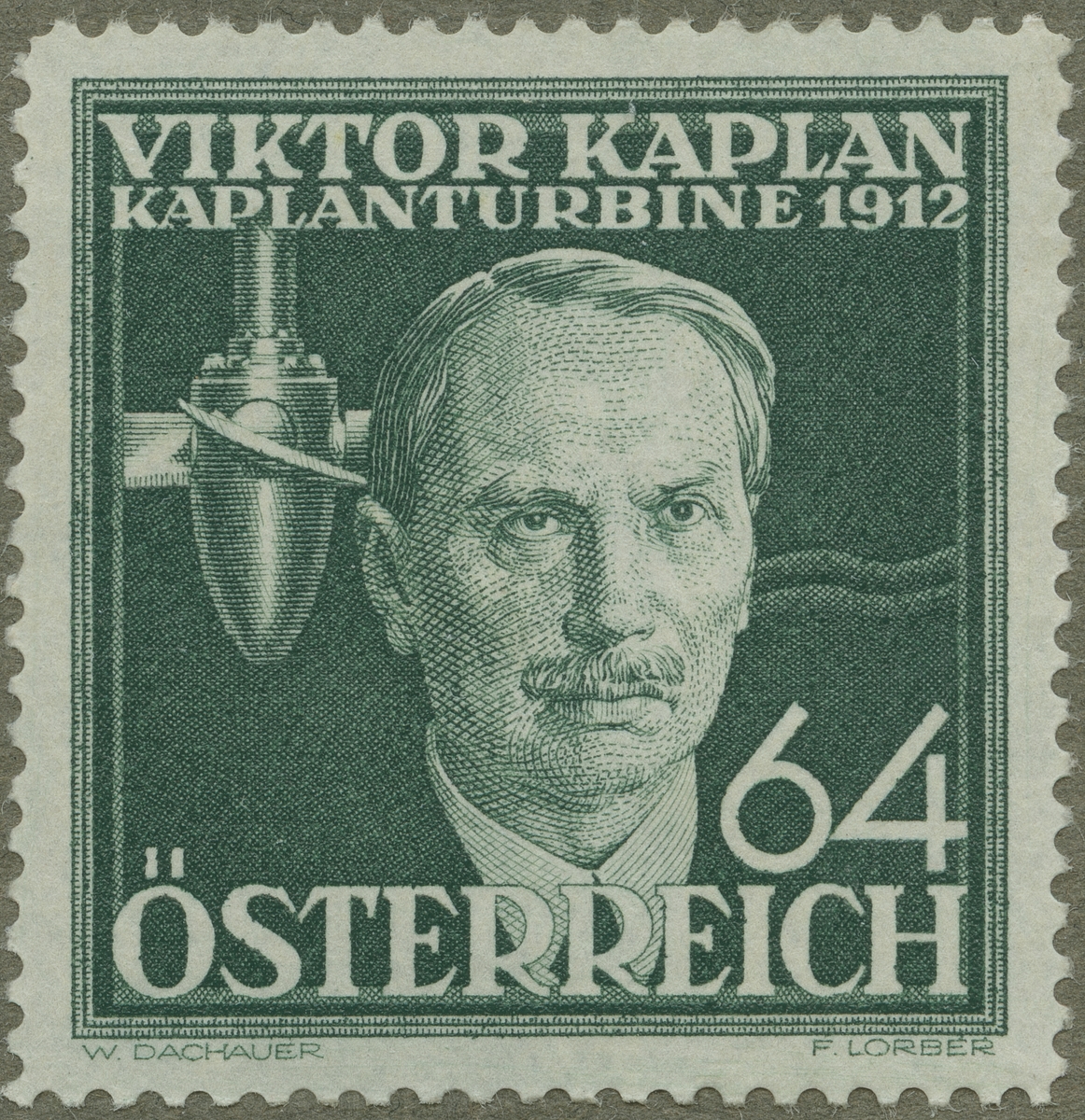 Frimärke från Österrike, 1936. Motiv av Viktor Kaplan: 1876-1934. Österrikisk ingeniör. Kaplanturbinen 1912. Vattenturbin med under drift omställbara skovlar.