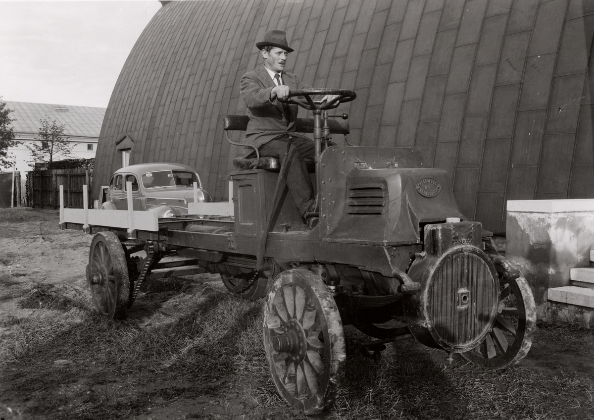 Lastbil av märket "Helios" med järnskodda hjul. Södertälje Verkstäder. Okänd man vid ratten.