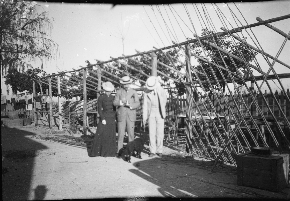 Drottning Victorias bilder. En kvinna, två män på en promenad med hunden.