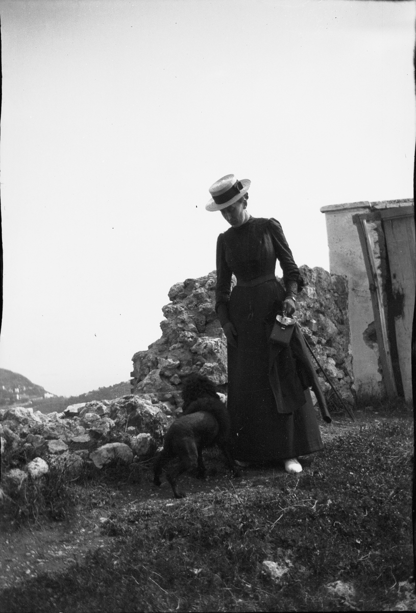 Drottning Victorias bilder. Kvinna ute med kamera och hund. Möjligen Drottning Victoria.