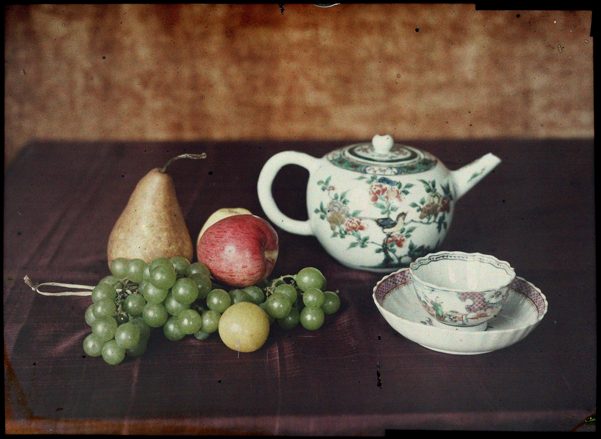 Lumière-autokrom. Stilleben. Tekanna, kopp, skål och frukter.
