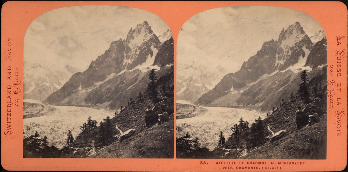Stereobild, två män på brant vid glaciär, Aguille, Charmonix.