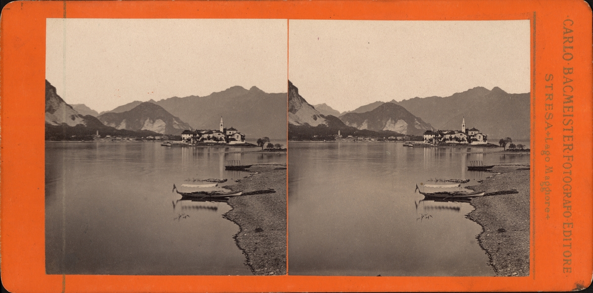 Stereobild av båtar invid strand på sjön Lago Maggiore (Lago Verbano).
