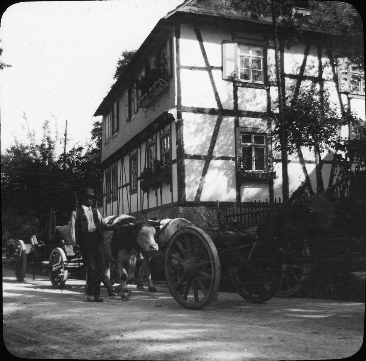 Skioptikonbild med motiv av man med kärra dragen av oxar, Schwarzwald.