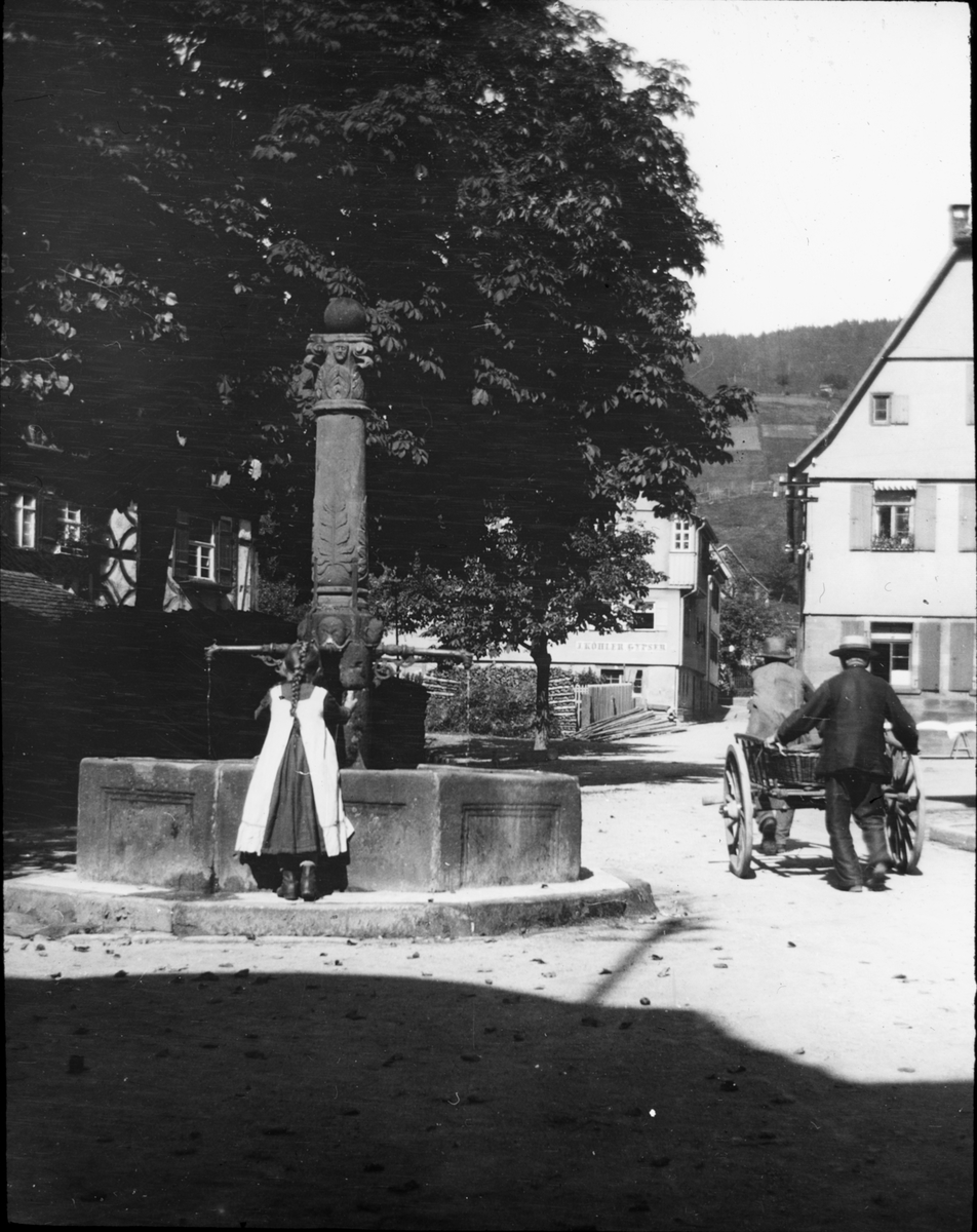 Skioptikonbild med motiv av liten flicka vid brunn, Schwarzwald.