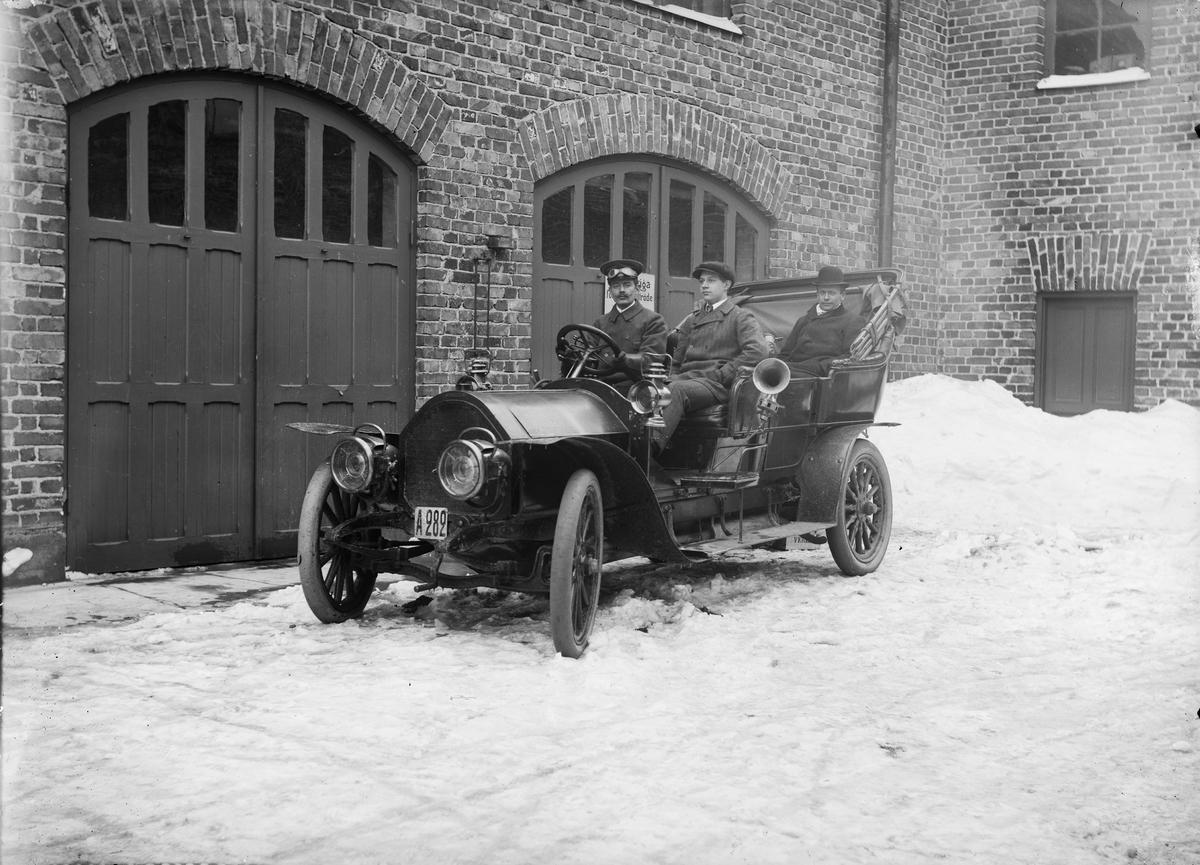 Två män med chaufför i bil utanför automobil/vagnfabrik. Troligen Gustaf LM Ericssons Automobilfabrik.