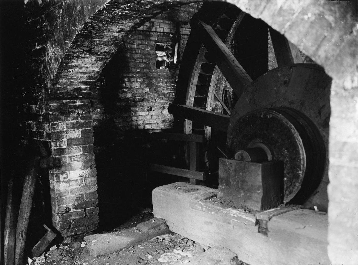 Vallonsmedjan vid Leufsta Bruk. Vattenhjul till skafthammare för räckning av stångjärn.