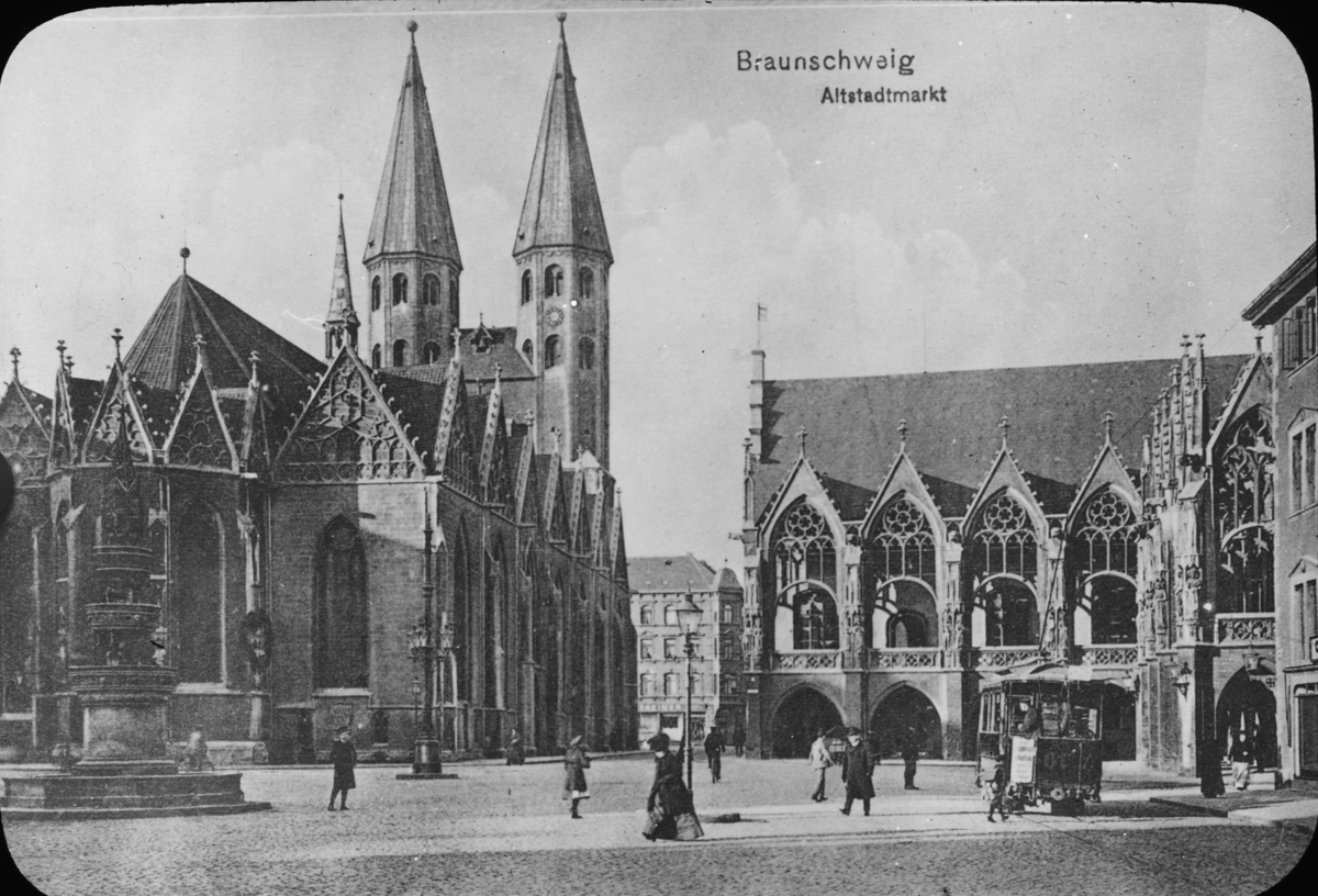 Skioptikonbild, tryckt bild med motiv från Alstadtmarkt. Rådhuset och kyrkan i Braunschweig.