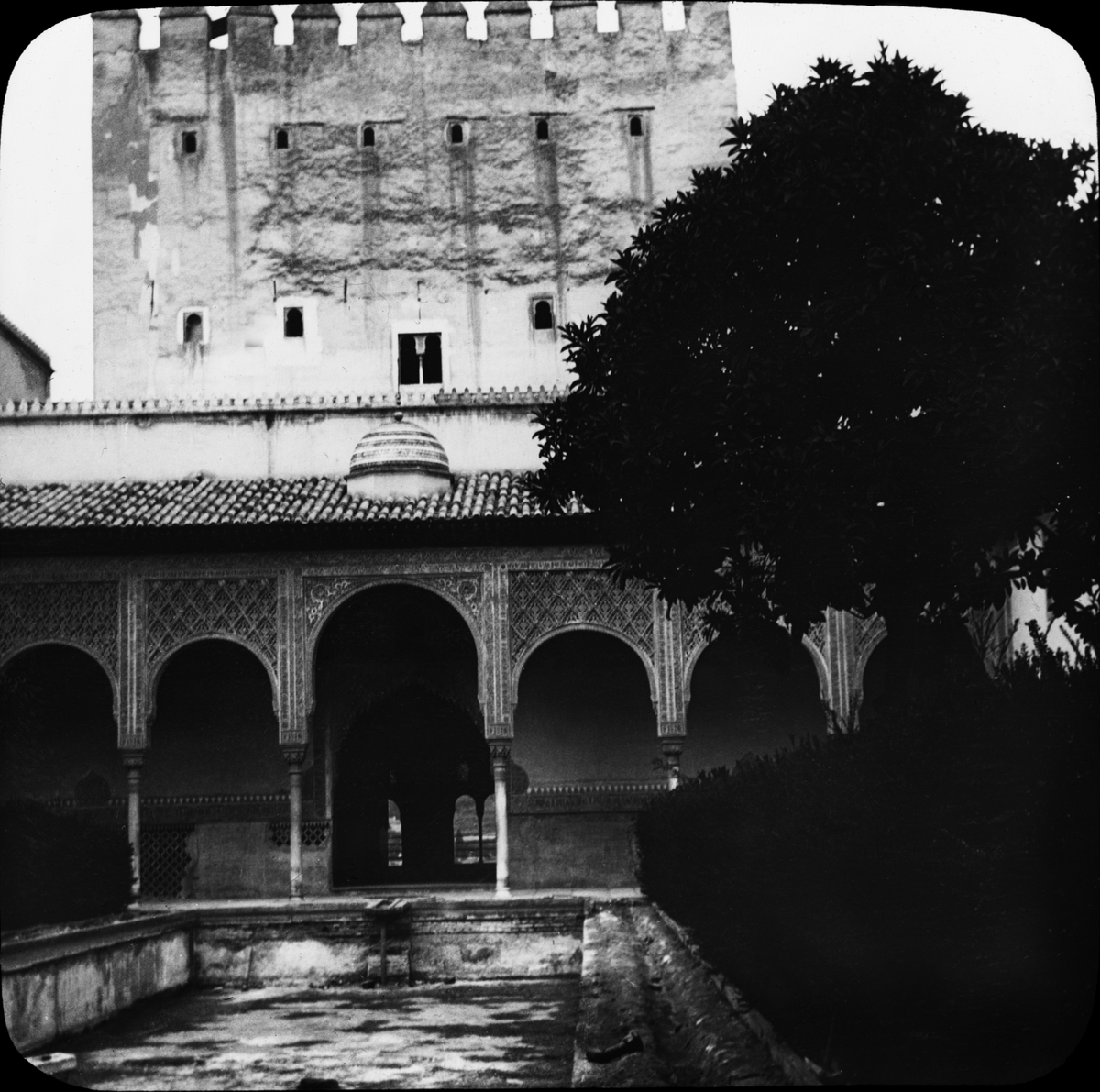 Skioptikonbild med motiv av Myrtengården i palatset, Alhambra.