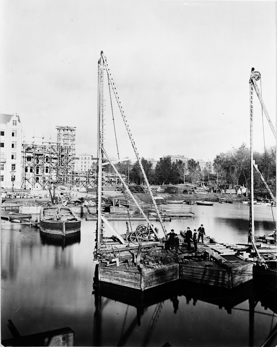 Pålning vid Djurgårdsbron 1896 med 8 hkr motor.