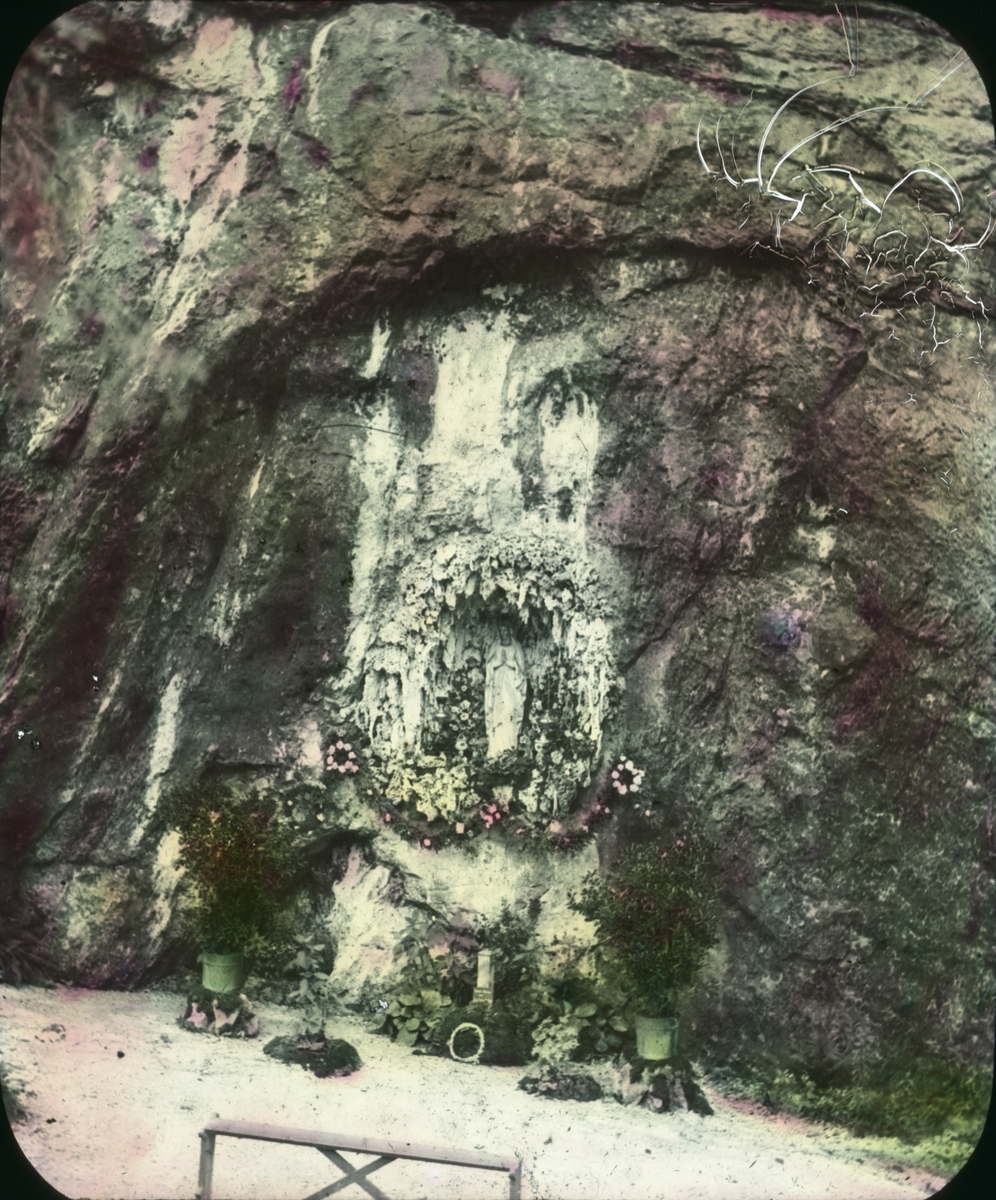 Kolorerad skioptikonbild med motiv av okänd grav.