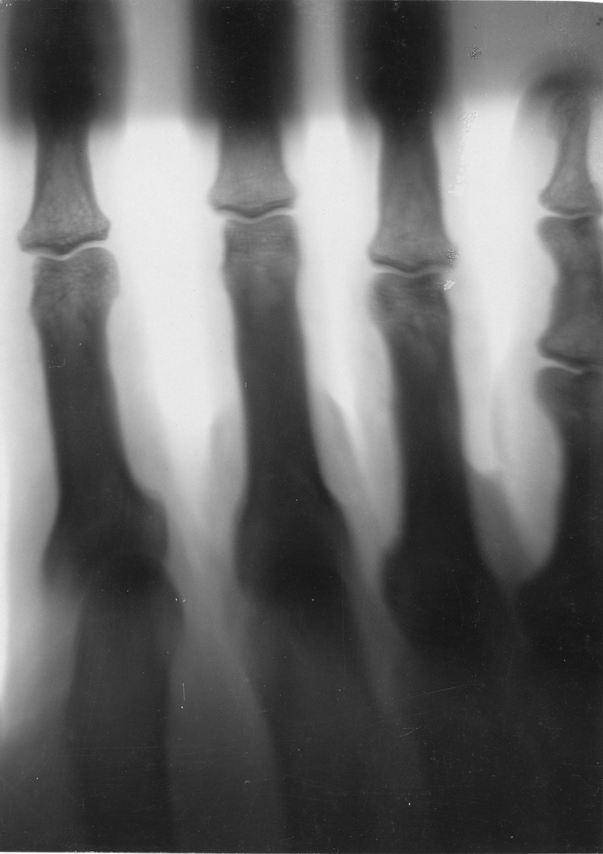 Fösök med x-strålar.Radiografi av lektor Zallanders hand, tagen i december 1896. Exponeringstid: 15 min med Crook's rör. Elkälla: Wimshersts handdrivna influensmaskin.