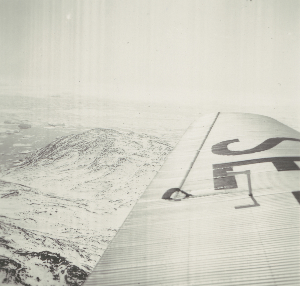 Fotografi från Albin Ahrenbergs resa till Grönland 1929. Vy över snötäckt bergslandskap. Bilden är tagen från flygplan och i förgrunden syns flygplansvinge.