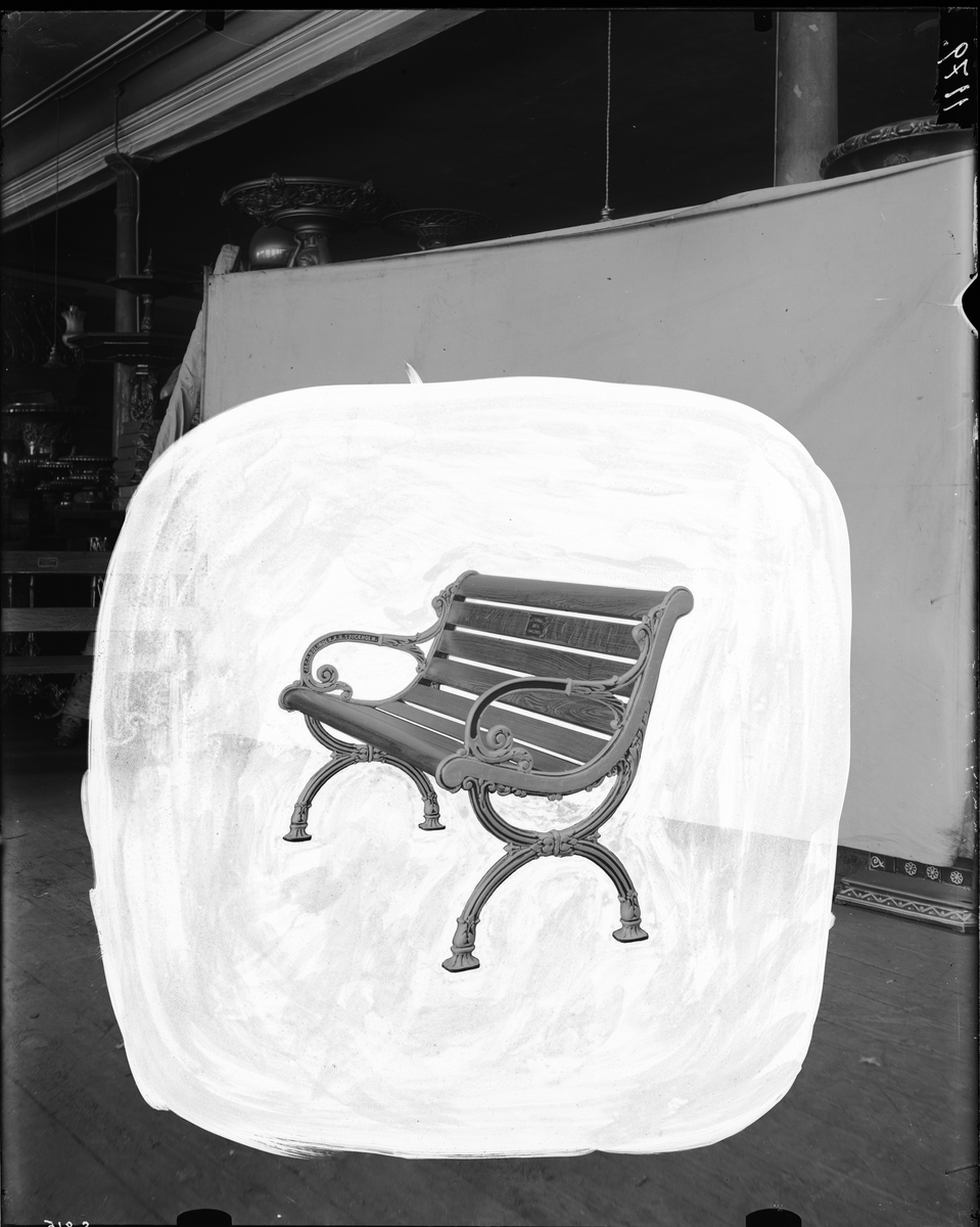 Svängd soffa med gjutjärnsstativ. Retuscherad bild.