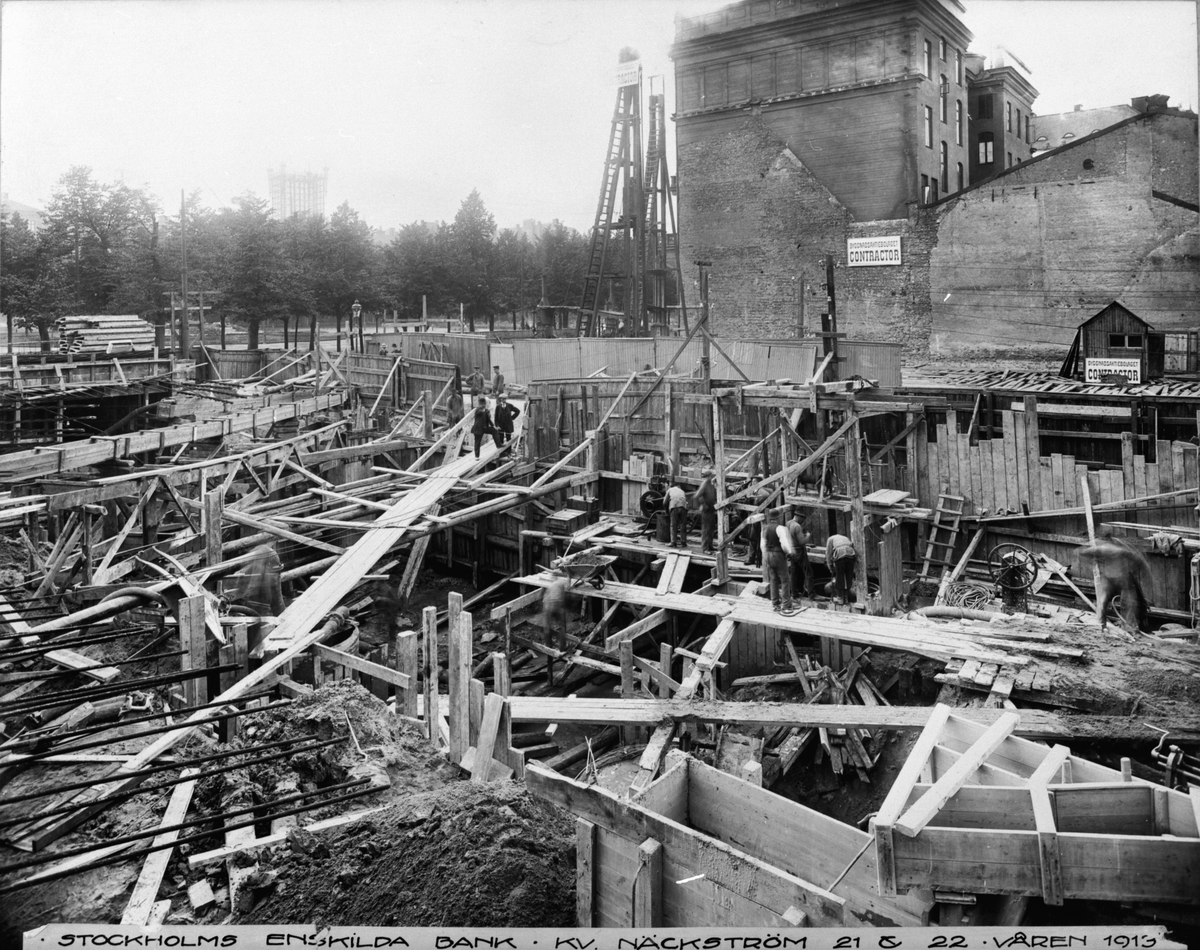 Byggherre: Byggnadsaktiebolaget Contractor, Stockholm. Kv. Näckström 21 & 22, våren 1913. Pågående brunnsänkningar vid grundläggning för stora bankbyggnaden. På bryggan ingenjör Almström och verkmästare Johansson. Byggnads AB Contractor.