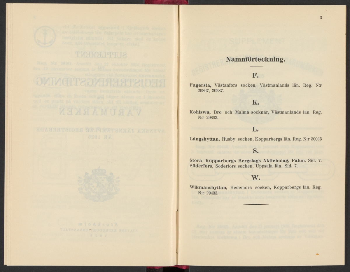 Titel: Svenska järnstämplar 1908-1929. Tryckt. Ur Carl Sahlins bergshistoriska samling.