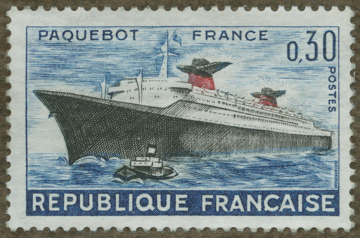 Frimärke från Frankrike, 1962. Motiv av Postförande ångaren "France:s" jungfruresa