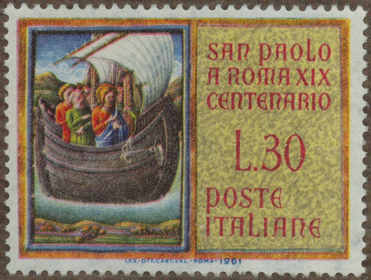 Frimärke från Italien, 1961. Motiv av Aposteln Paulus ankommer till Rom 1900-års minne