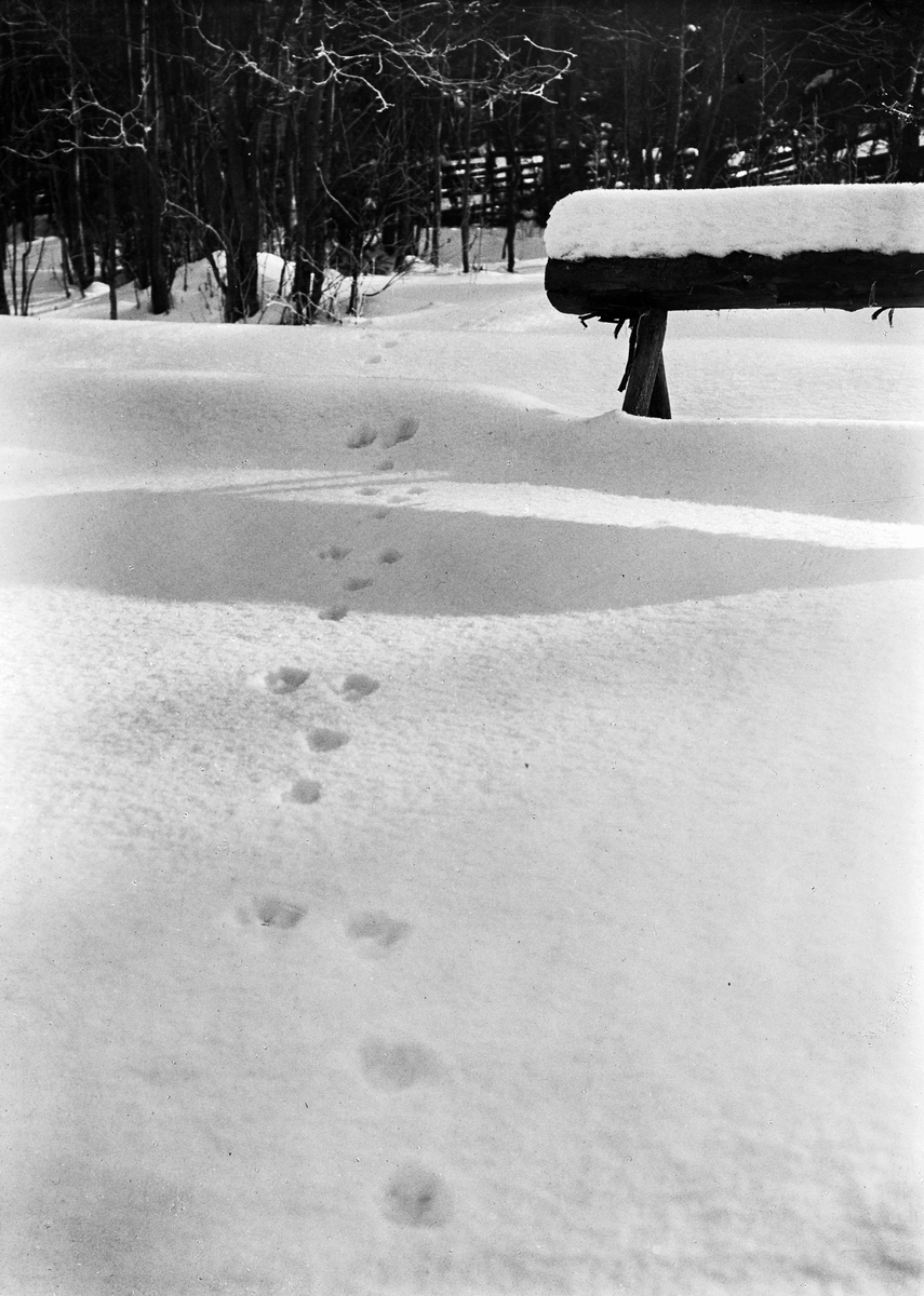 Diapositiv med motiv av landskap i vinterskrud. Troligen i Hedemoratrakten. Spår i snön.